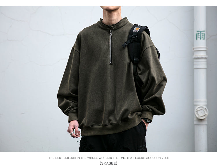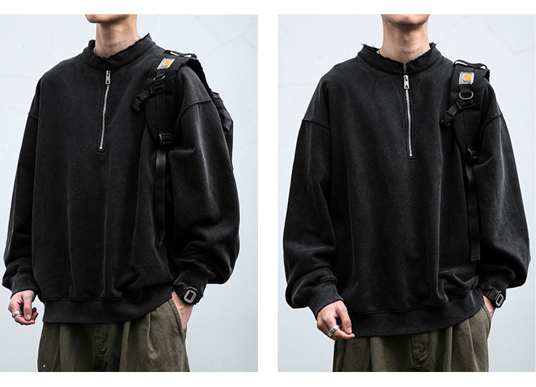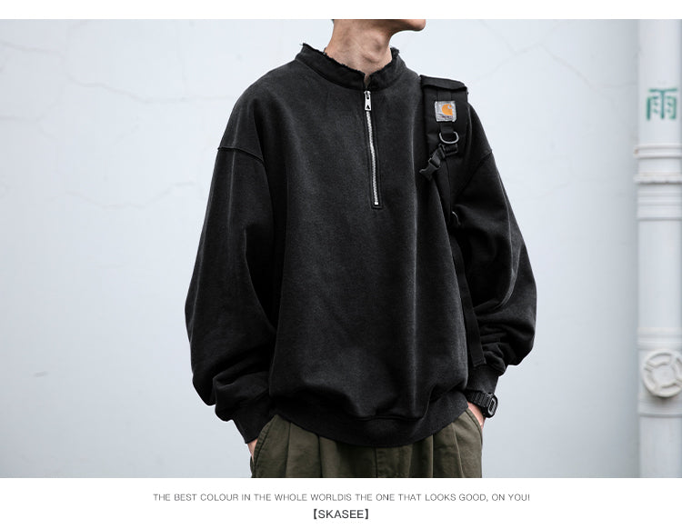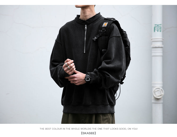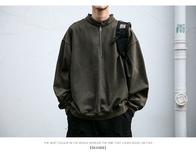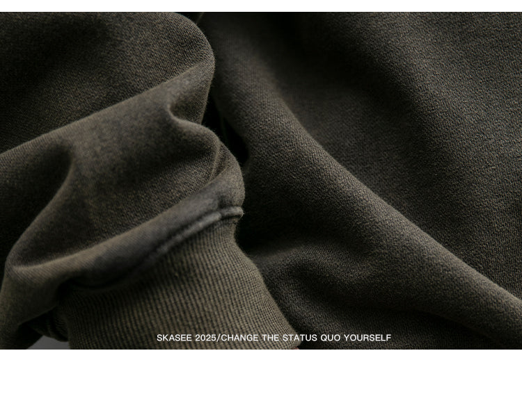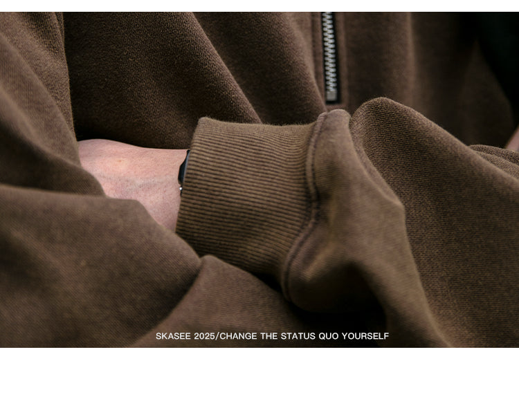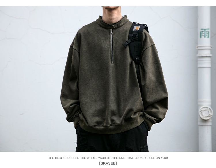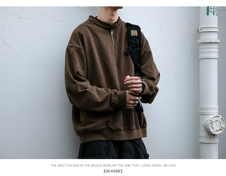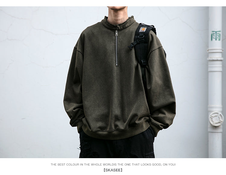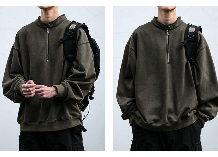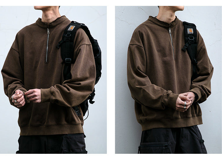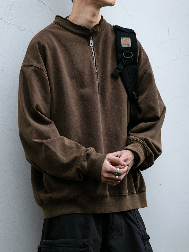 Unisex 465g Washed Vintage Sweatshirt - Boxy Half-Zip Snowflake Knit Pullover