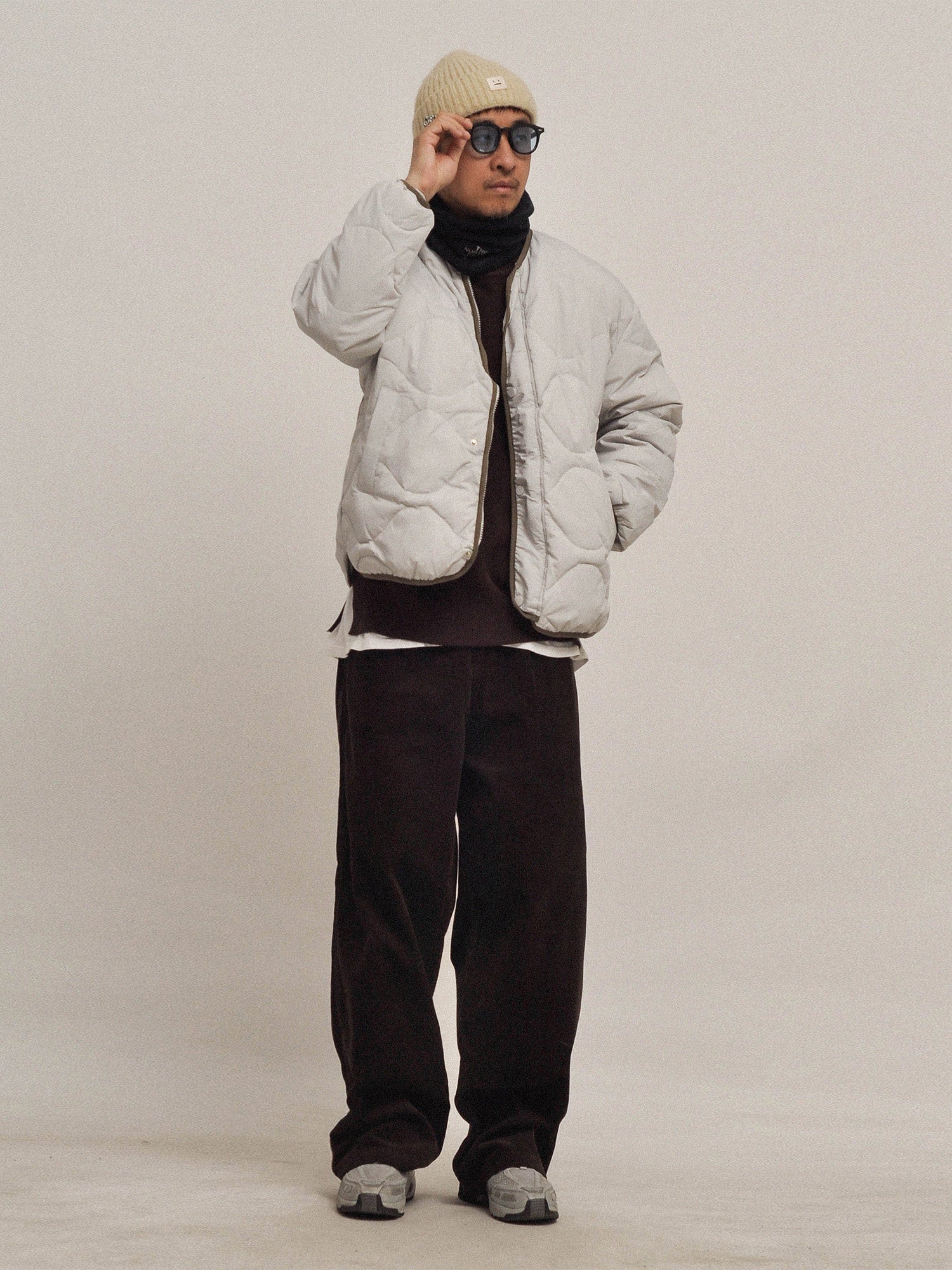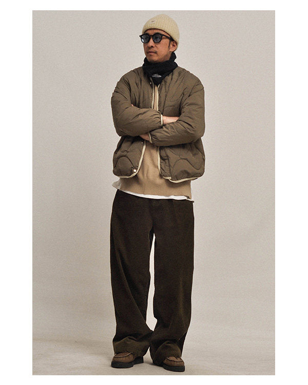 This Winter 2025 down inner jacket embodies classic Japanese layering philosophy with elegant simplicity. The 90% white goose down filling (107-132g) provides exceptional warmth while remaining lightweight and packable. The gourd pattern quilting adds subtle texture. The Teflon-treated nylon fabric offers water resistance. The collarless drop shoulder design allows versatile layering under coats or solo wear. Available in Army Green, Dark Navy, and Light Gray for sophisticated styling.
