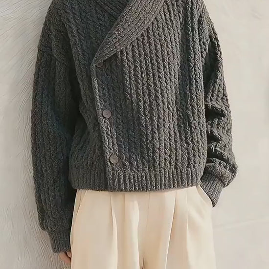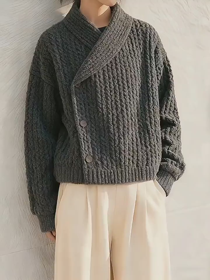 Women's 2025 Winter Old Money Style Knitted Sweater Jacket - Dark Gray-Green Fruit Collar Thick Thread Lazy Fit Top