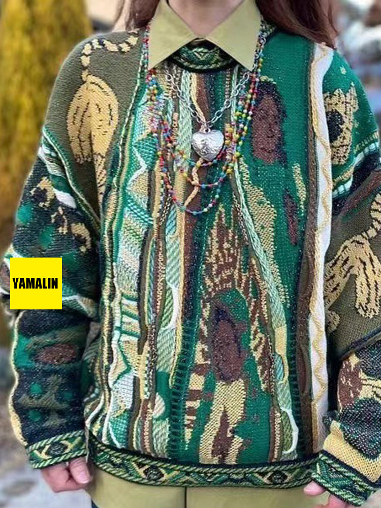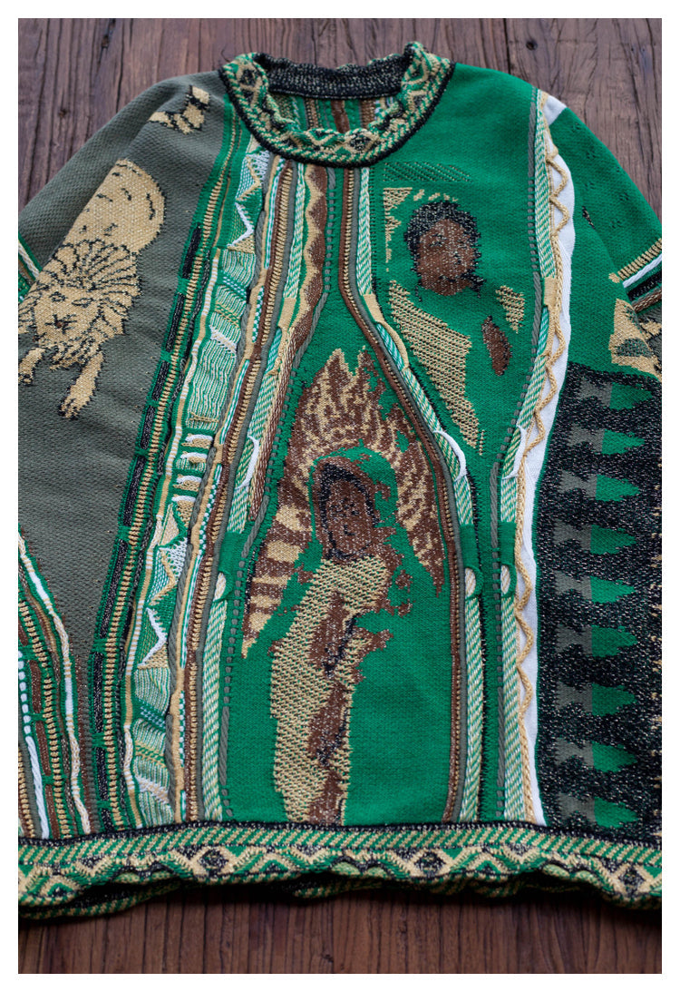Vintage Green Lion Knit Sweater - Japanese Retro Crew Neck Pullover