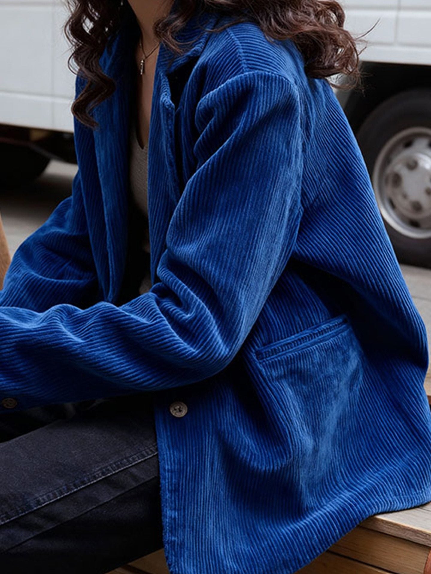 This Winter 2024 jacket combines striking Klein blue with Chanel-inspired elegance. The unique blend of corduroy and chenille textures creates luxurious, high-end appeal with thickened construction for warmth. The suit collar and single-breasted button closure maintain classic sophistication, while the short length creates a contemporary silhouette. The straight fit and versatile design make it perfect for daily wear with refined style.