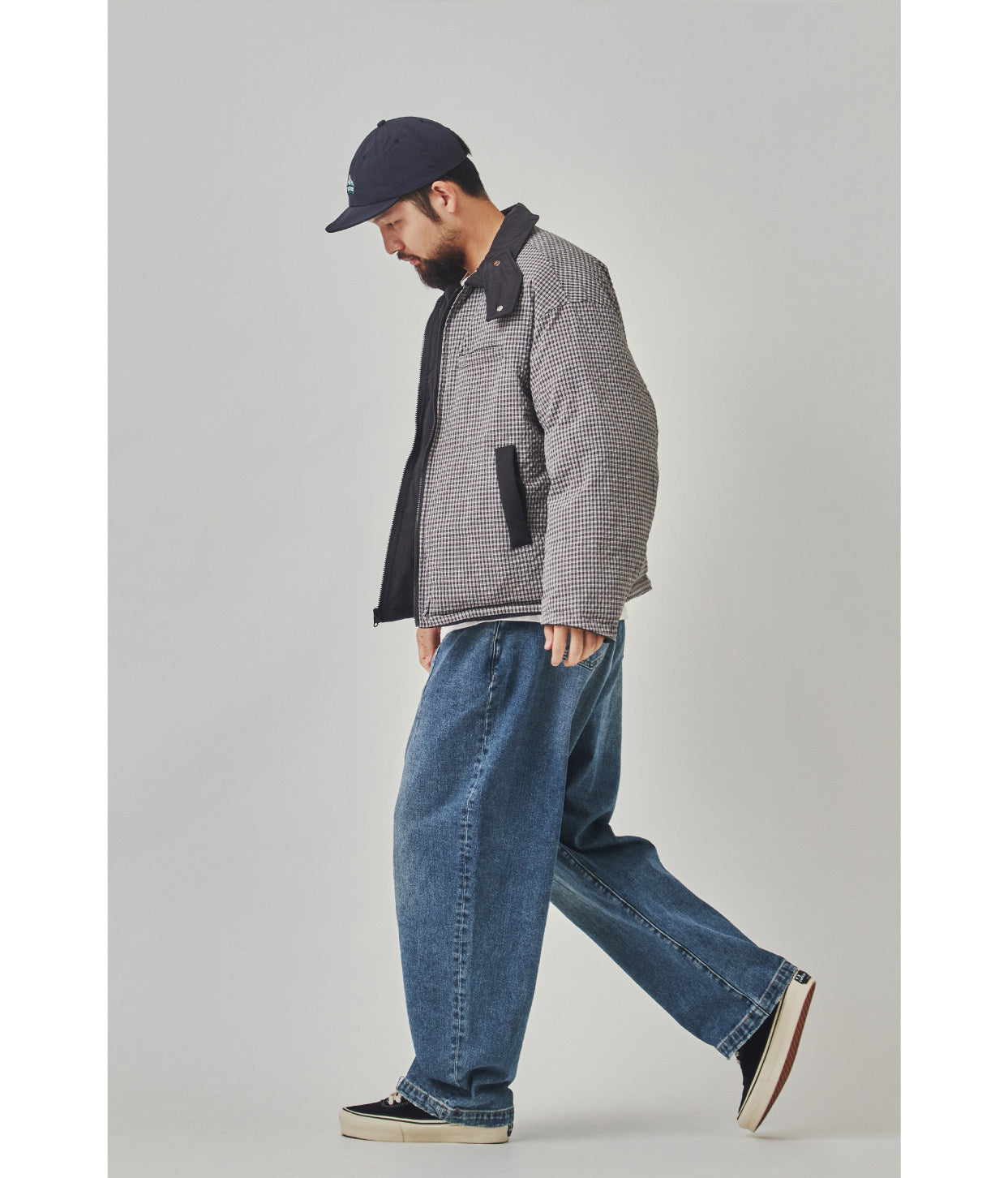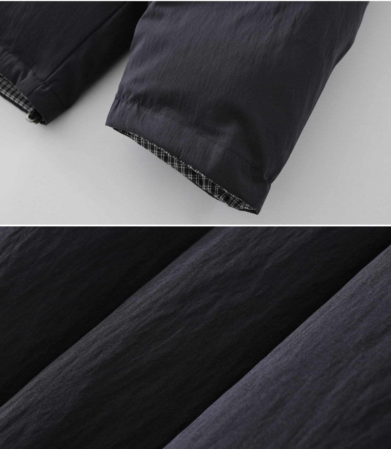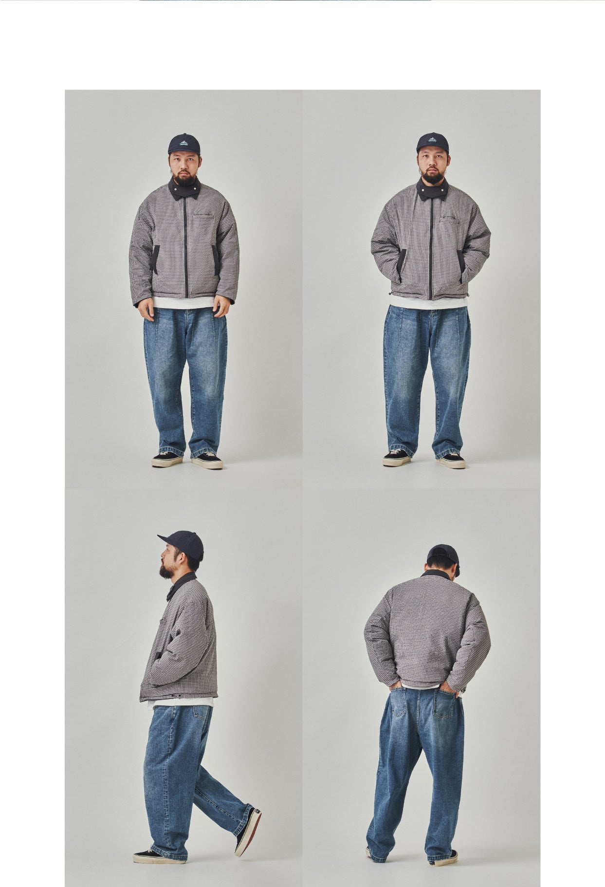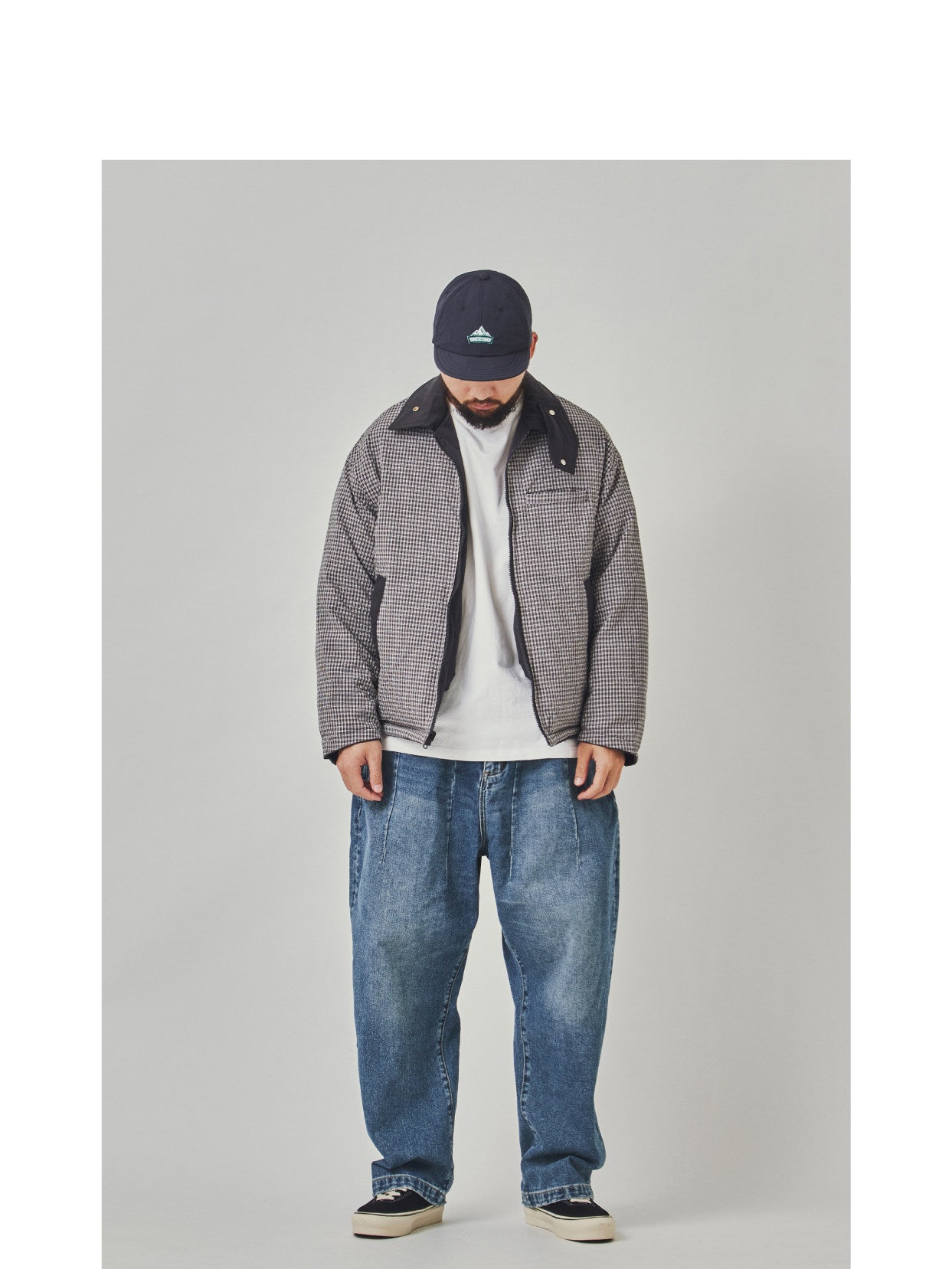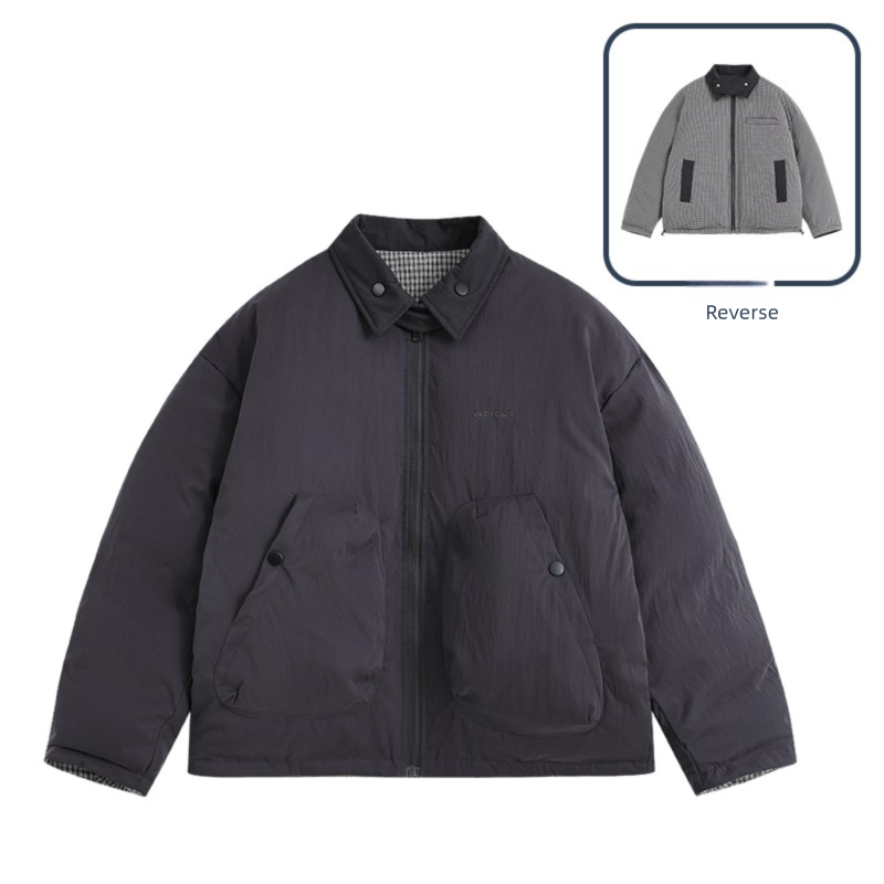 This Winter 2025 reversible jacket offers exceptional versatility with its double-sided design. The twill fabric with sanding craft creates soft texture, while the composite fabric lining and silk floss filling ensure warmth. The beige plaid pattern adds classic appeal, and the multi-pocket design provides practical functionality. The lapel collar and zipper closure make it easy to wear, while the loose fit allows comfortable layering.