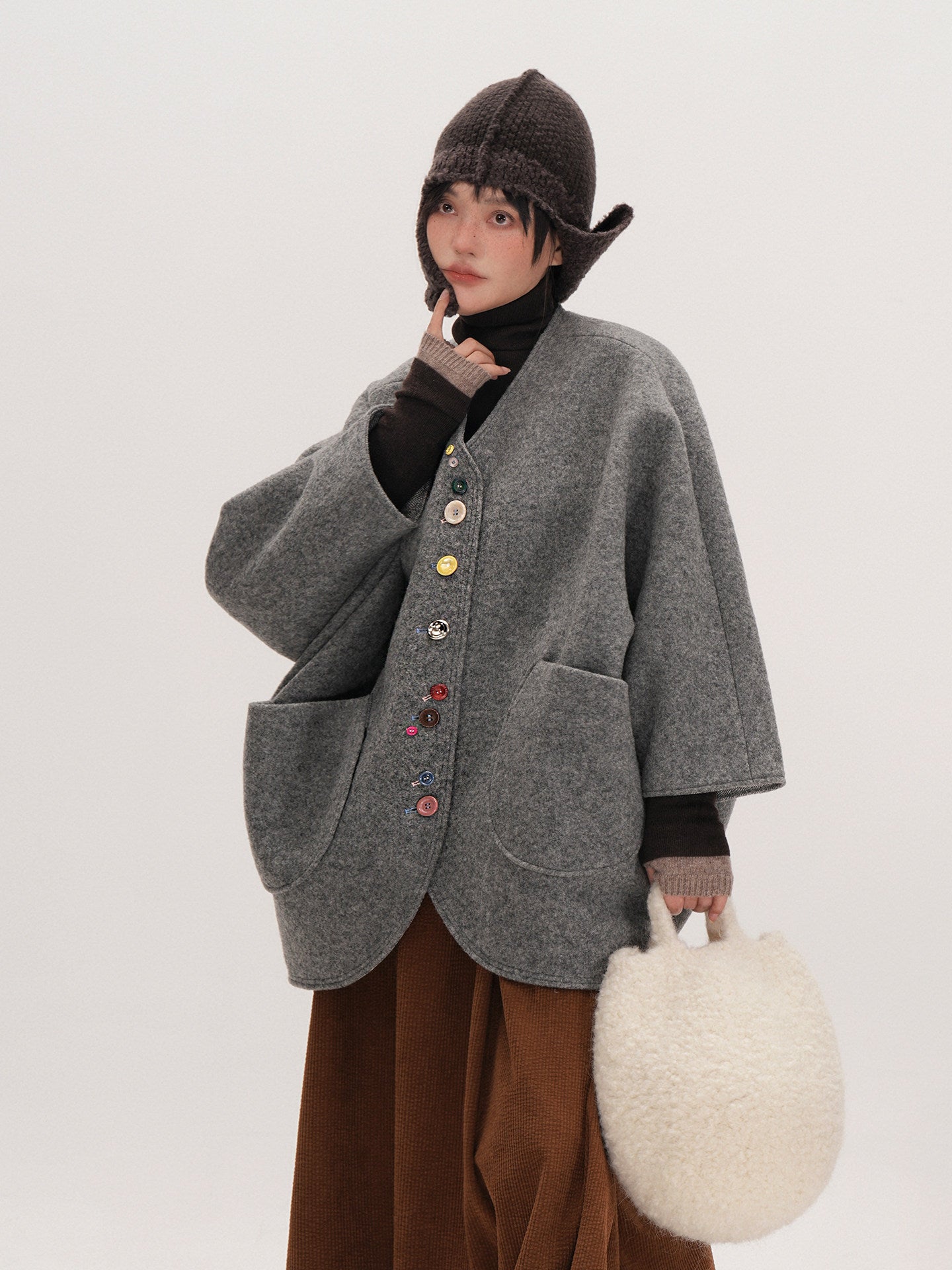 This Winter 2025 cardigan features original design with composite wool fabric (90% polyester, 10% rayon) in sophisticated smoke gray. The batwing sleeves and loose fit create a contemporary oversized silhouette perfect for layering. The irregular color buttons add unique artisanal character (buttons are randomly selected and vary by piece). The thick fabric weight (0.9kg) provides substantial warmth. The V-neck and single-breasted button closure make it versatile for casual wear.
